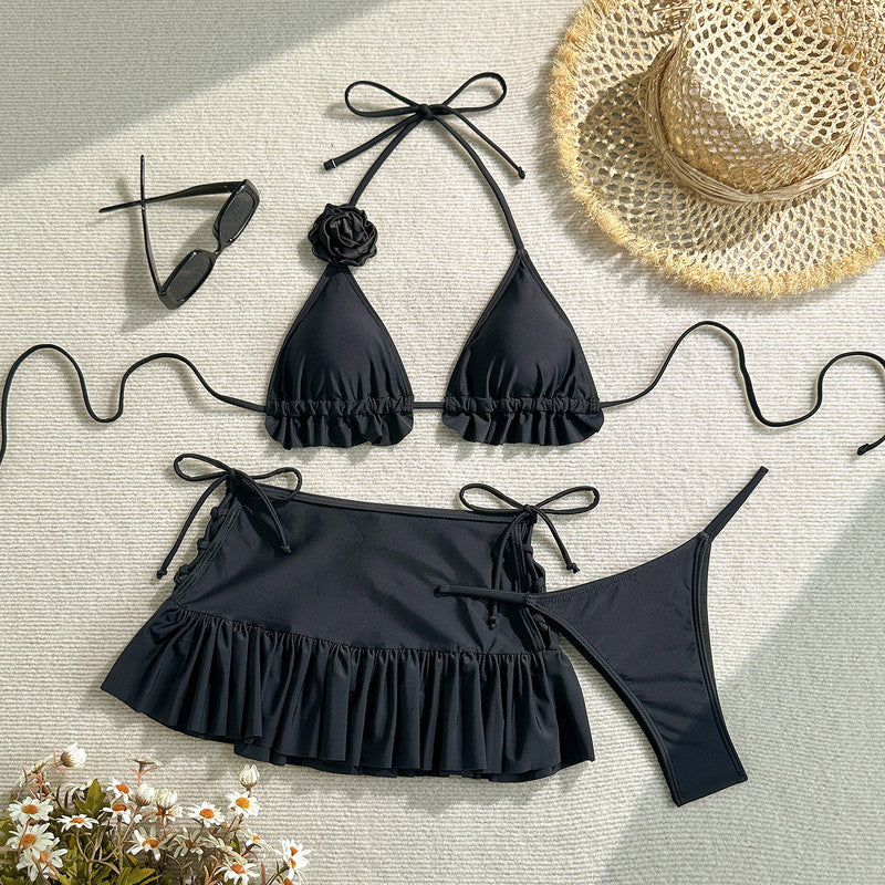 Black Solid Ruffle Bikini Set With Beach Skirt