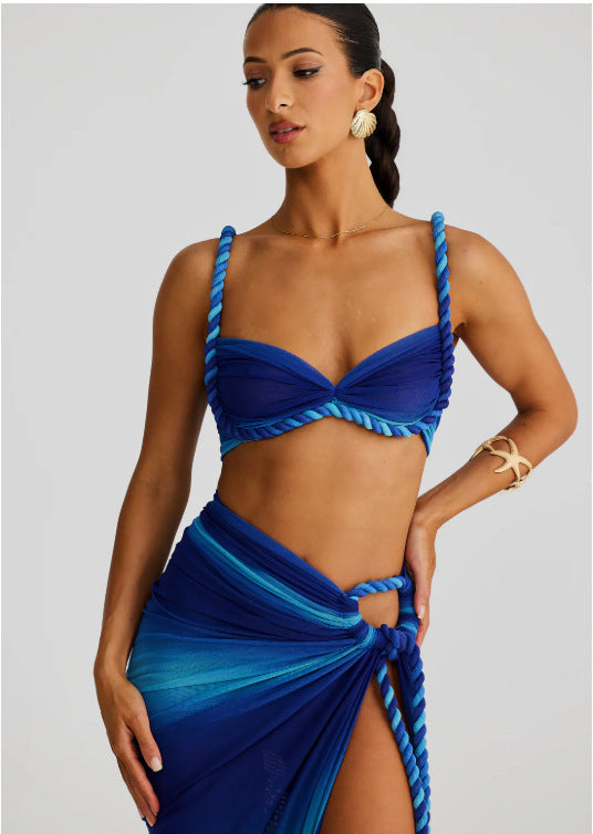 Blue Gradient Bikini Top and Slit Sarong Without Pads