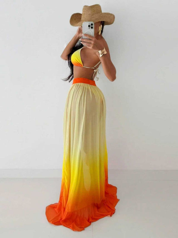 Orange Solid Triangle Bikini Set with Sarong
