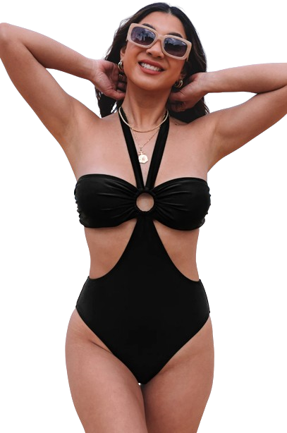 Black Halter O-ring Ruched Bust One Piece Swimsuit