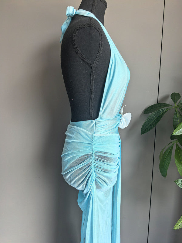 Sky Blue Solid Deep V One-Piece Swimsuit With Sarong