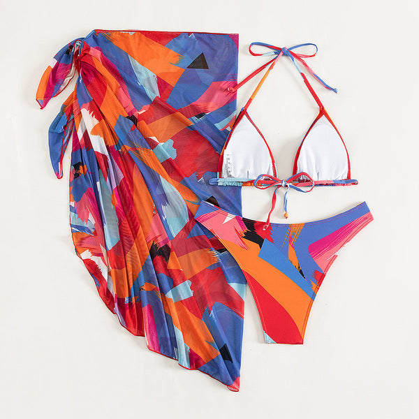 Allover Print Halter Triangle Bikini Swimsuit with Beach Skirt Multicolor