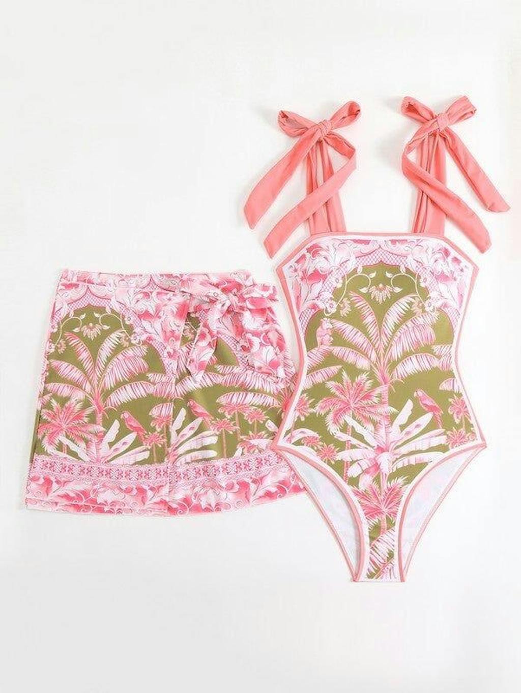Tropical Print One-Piece Swimsuit Set with Skirt Pink